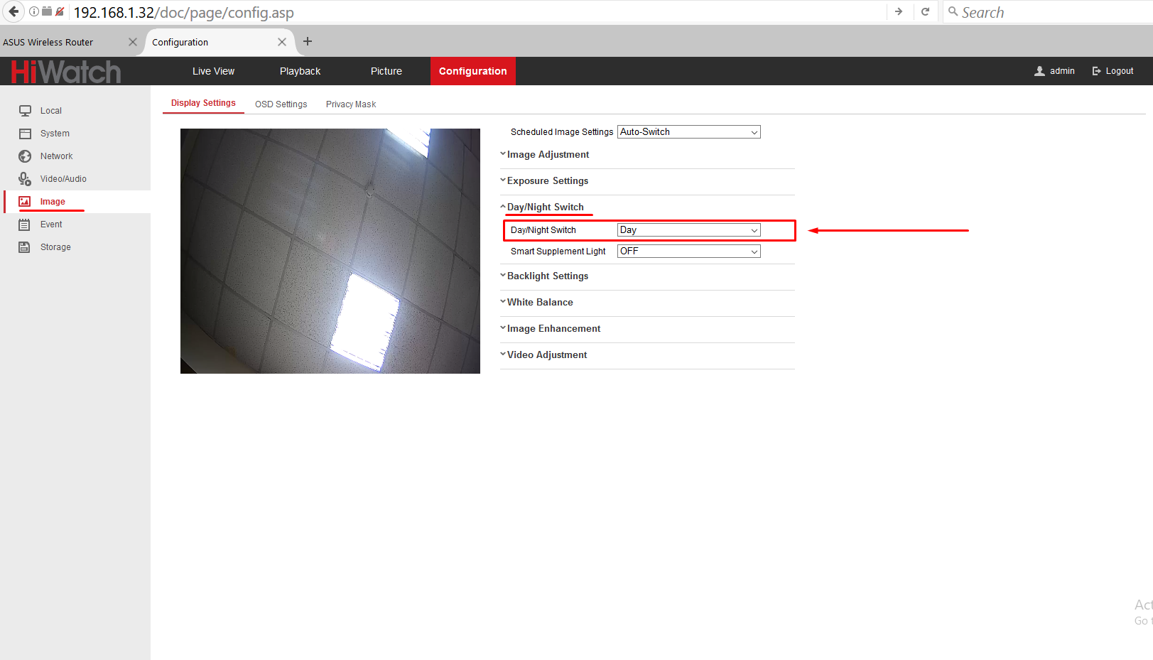 - В меню Configuration, в части Image, во вкладке Display Settings необходимо найти пункт меню Day/Night Switch и выставить режим переключения на Day, как показано ниже: