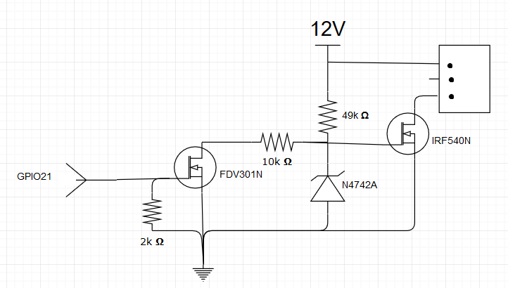|Наименование|Кол-во|Ссылка |–|–|– |FDV301N | 1 | |IRF540N | 1 | |N4742A | 1 | |2k resistor | 1 | |49k resistor | 1 | |10k resistor | 1 | |NodeMCU-32S | 1 | |LM2596 | 1 |