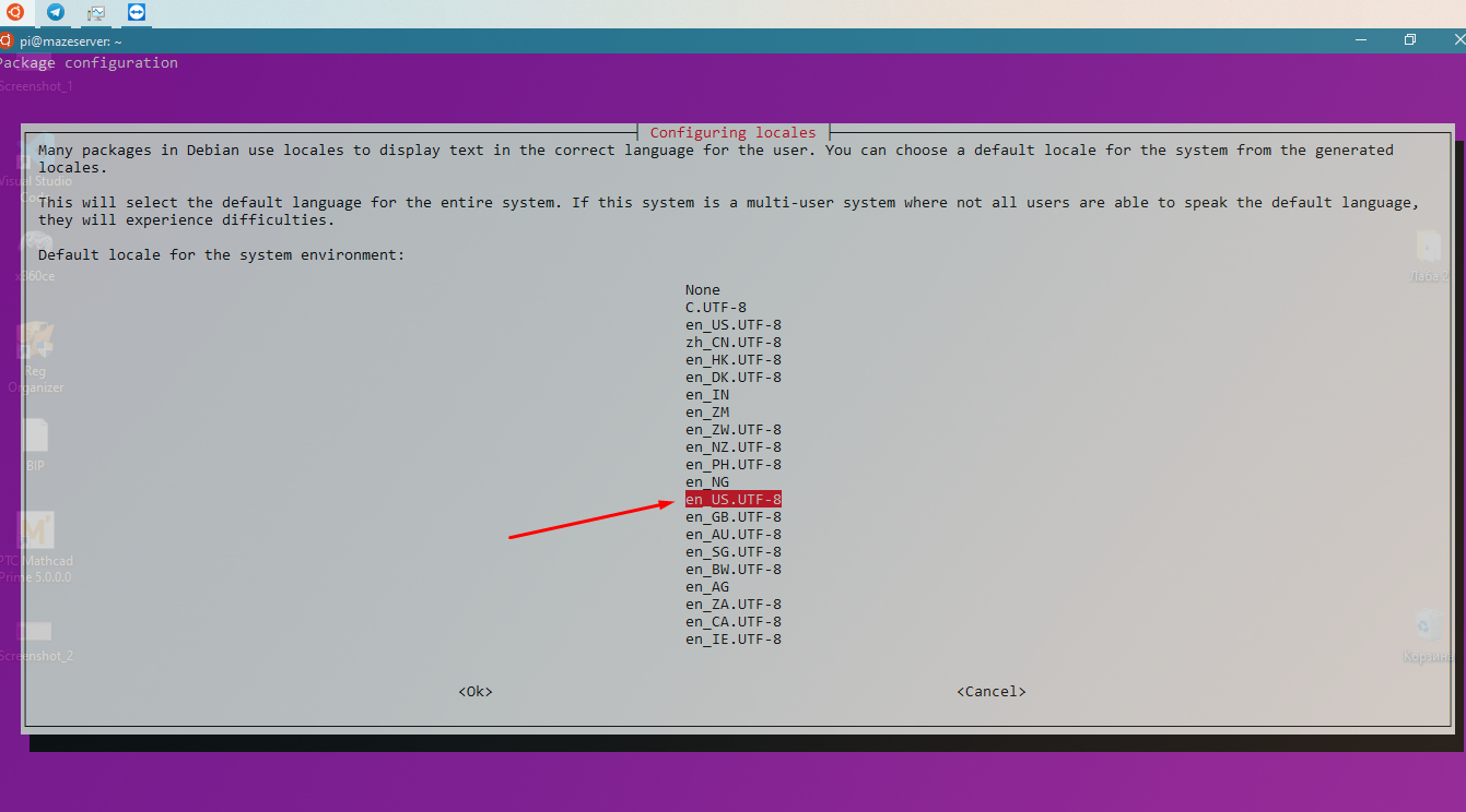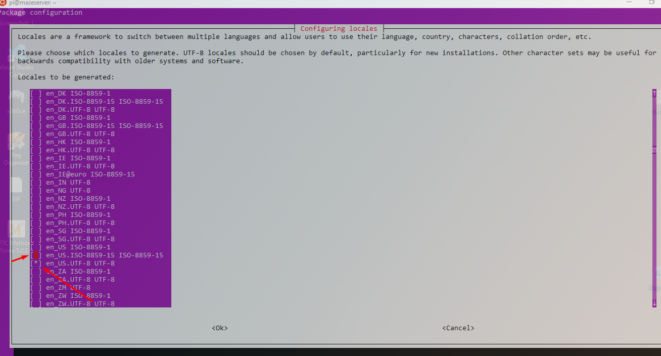 Затем пролистать весь список и убрать выбор (так же как и выбрать - делается с помощью пробела) с других локалей кроме en_US.UTF-8 (скорее всего будет отмечена локаль zh_CH.UTF-8), нажать Tab (курсор выделить <Ok> внизу окна) и Enter. В следующем окне выбрать en_US.UTF-8 с помощью стрелок и клавиши Enter.