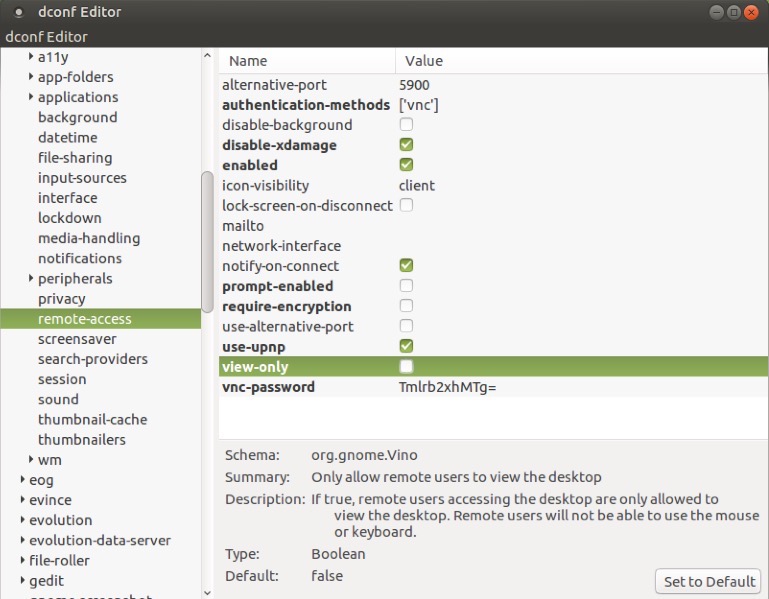 Далее в Applictions -> System Tools -> dconf Editor org -> gnome -> dektop -> remote-access