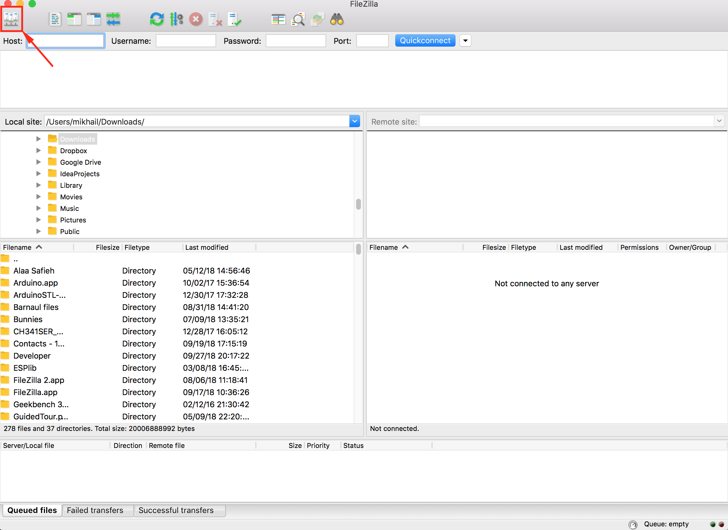 - нажать Connect - установится соединение с сервером по FTP, откроется интерфейс для передачи файлов как в Total Commander