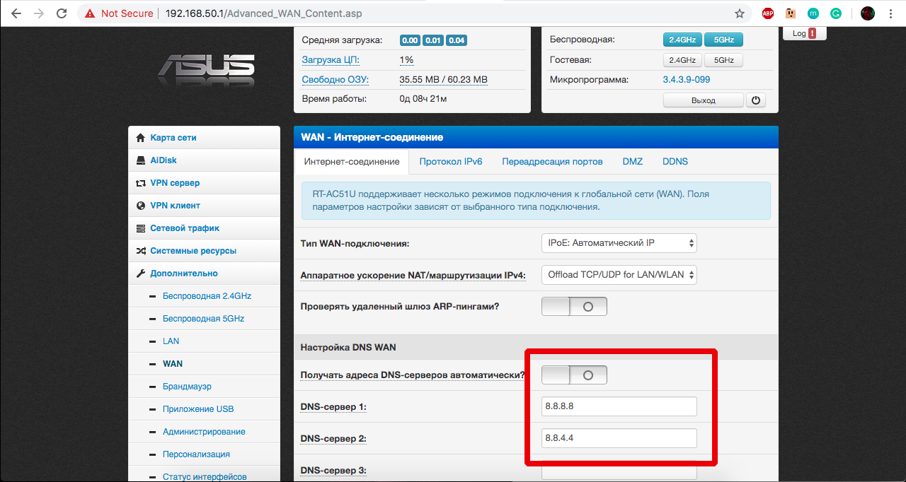 Wan - Internet connection Поменять автоматическое получение на manual. Вписать адреса google: