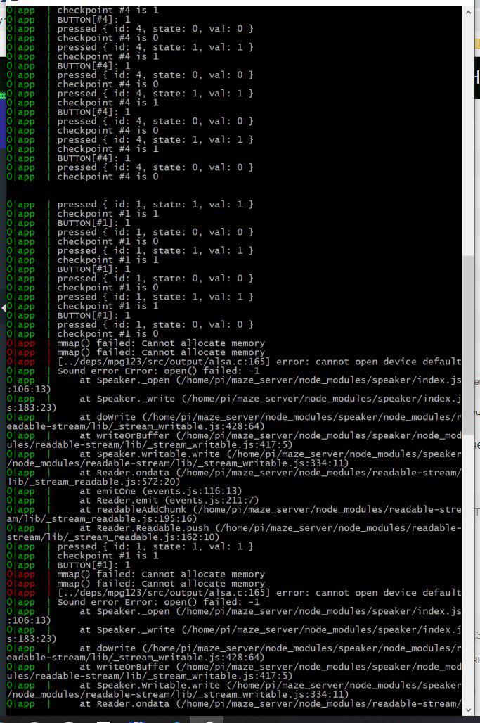 Ошибка возникает только на Node 2. Связана она с тем, что при дребезге кнопки звук вызывается на проигрывание несколько раз, при этом ресурсы сервера, выделенные на проигрывание предыдущего звука еще не освобождены. Таким образом нагружается процессор и заполняется оперативная память из-за чего в pm2 log отображается ошибка, говорящая о том, что не хватает ресурсов для воспроизведения звука.